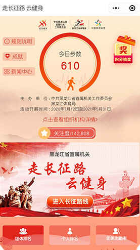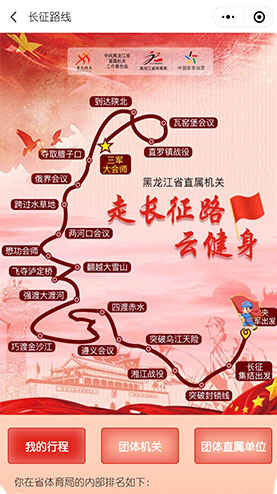 黑龙江省直机关工委与黑龙江省体育局共同组织了以“健身你我他 奋进新时代”和“全民健身 活力中国”为主题的“走长征路 云健身”活动。通过云端走长征路,每日完成基本步数,完成云健走,打卡长征路上著名红色教育基地,阅读长征路上和体育健身的相关内容,回答学习问题,参与全民健身,锻炼身体,继承和弘扬好伟大的长征精神。