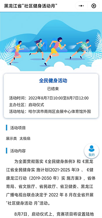 协助黑龙江省体育局2022年8月在全省开展的“社区健身活动月”活动,研发统计程序,以方便全省各市地、各街道社区在组织群众参与活动的同时,将活动情况进行统计,形成活动大数据,数据结果既可作为全省参与全民健身活动的重要统计,同时也是对各市地、各街道社区监督与考核参考。本套程序分为用户端(手机小程序)和统计审核管理平台(电脑端)。