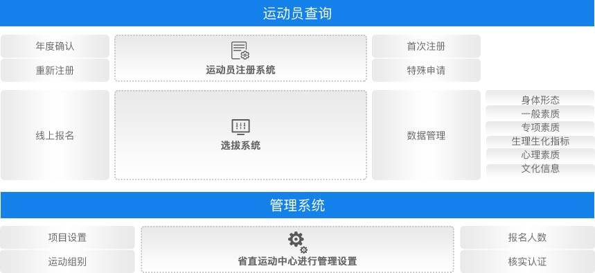 系统包括首次注册、特殊申请、年度确认、重新注册和运动员查询等功能。各市县训练单位可线上进行运动员注册申请,各市地体育局对注册申请进行审核,各省直运动管理中心对于审核后的运动员注册信息进行审批、归档。